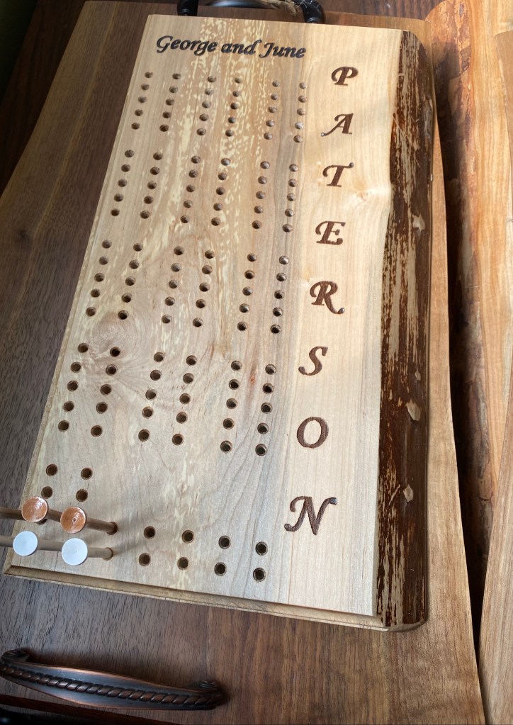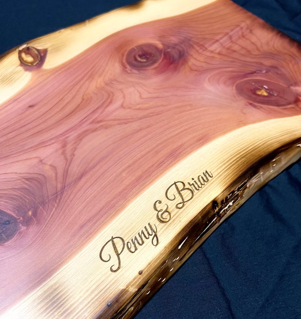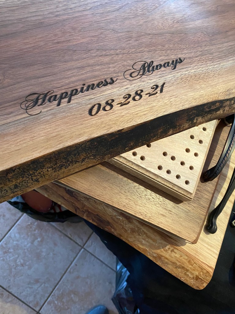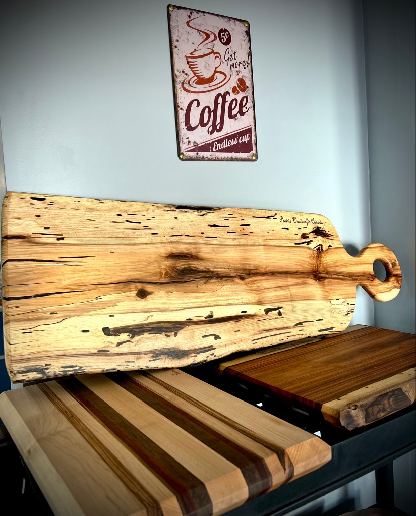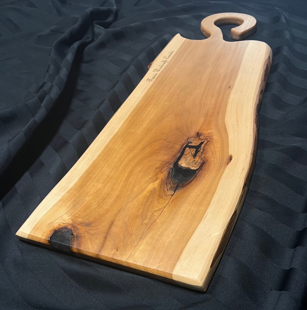 Welcome to Prairie Woodcrafts (a division of Jespersen’s Seasonal Services)! We are creators of fine woodworking and woodcrafts. Every piece is built with care and attention to detail. We start with the most beautiful pieces of wood we can source from local hardwood retailers, local sawmills, and even lumber we’ve harvested and saved ourselves. We finish each piece with the highest of quality finishes after shaping and sanding to a buttery smooth finish. We’ve built tables, benches, charcuterie and cutting boards, wine racks, CUSTOM COASTERS, signs and much, much more. Most of our woodworking can be customized with an engraving of a name, cheeky saying, or image. Have a look below at a few of our creations, and CLICK HERE to inquire about a custom order.